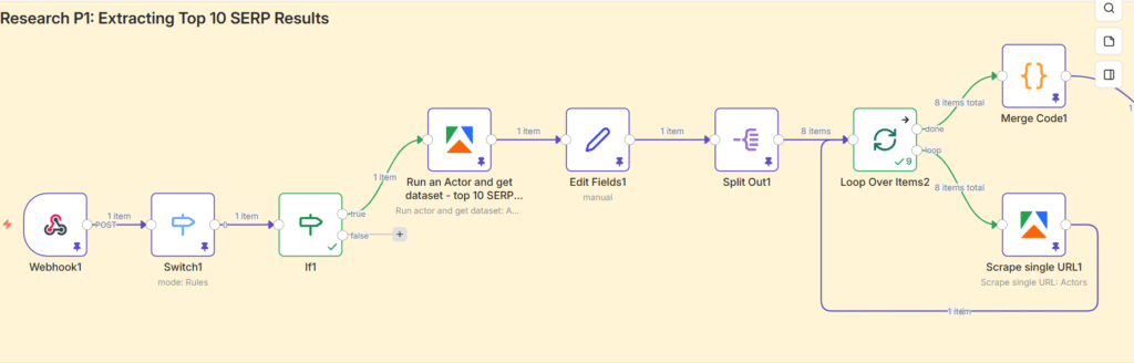 A Set node then extracts only the organic results from the Apify response and consolidates them into a single clean array, stripping out ads, knowledge panels, and other SERP features that aren’t useful to the pipeline.