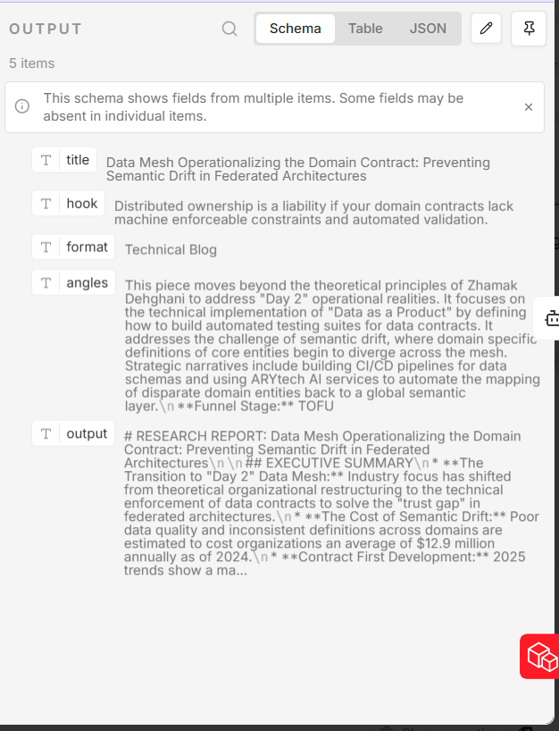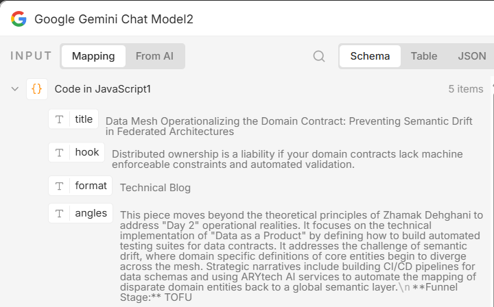 The output from this agent is a single JSON array containing all five article ideas. A JavaScript Code node then breaks this array into five individual items, so that each article idea can be processed independently by the next agent in the pipeline.
