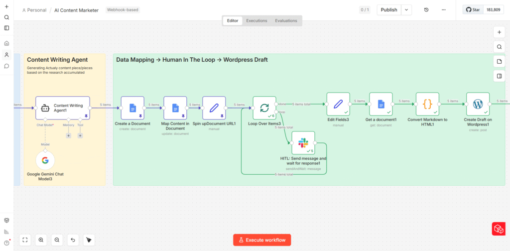 The Human-in-the-Loop (HITL) step exists for a specific reason: AI writing agents, regardless of how well-prompted, can produce output that is technically correct but editorially wrong. The tone might be off. A statistic might be outdated. The angle might not fit the current editorial direction. These are judgment calls that require a human – not because the machine failed, but because editorial quality is a moving target that changes based on context a machine cannot always access.