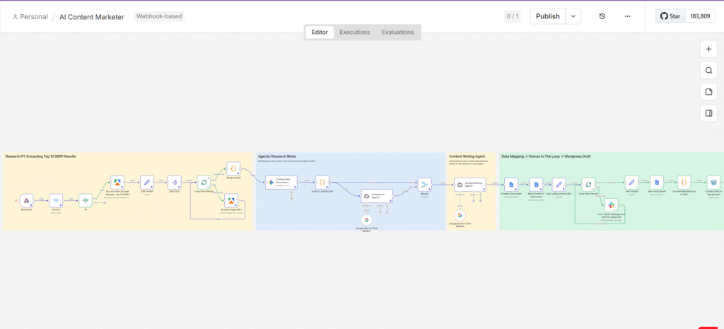 This article is a detailed breakdown of how I built an automated, AI-powered content pipeline using n8n – one that takes a target keyword, crawls what’s already ranking on Google, generates five research-backed article ideas, writes the drafts, routes them through human approval, and publishes them to WordPress as formatted drafts. No heroics. No all-nighters. Just a workflow that runs while you’re doing literally anything else.