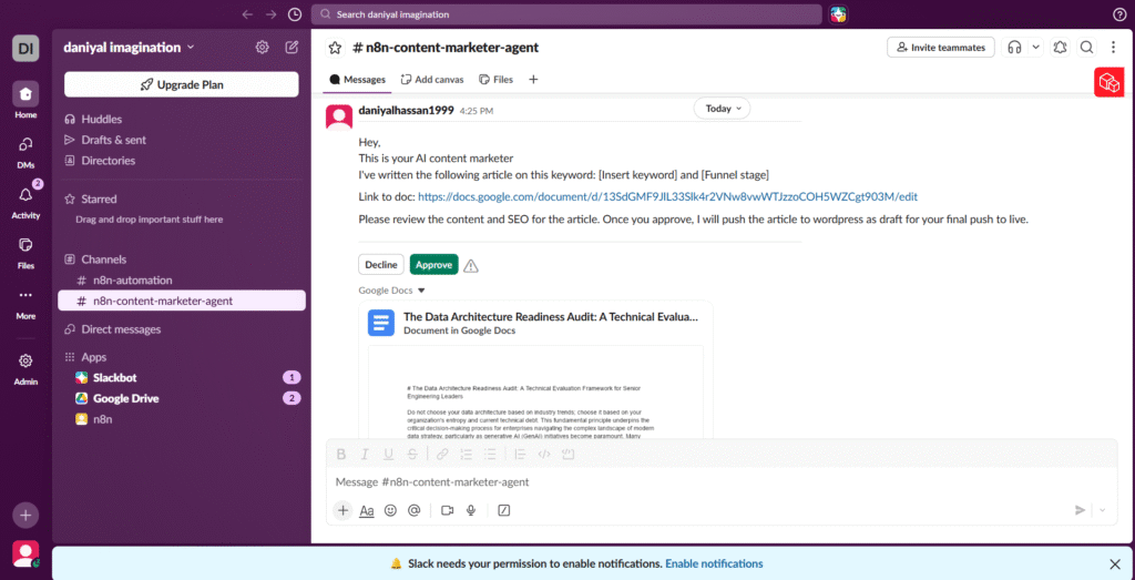 This is the part of the pipeline that some automation advocates skip – and shouldn’t. Once the articles are staged in Google Docs, n8n sends a Slack notification to the relevant channel. The message includes the article title, a link to the Google Doc, and a prompt asking for approval before publication proceeds.