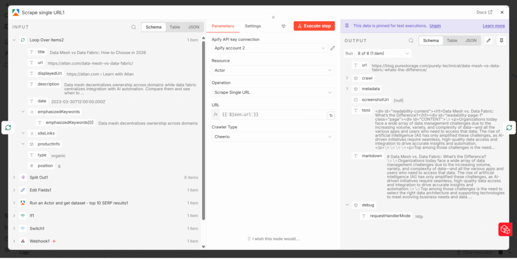 Having a list of ranking URLs is useful. Having the actual content from those URLs is far more useful. A second Apify actor – the Website Content Scraper – handles this. The organic URL array is split into individual items using a Split Out node, which allows n8n to process each URL separately inside a loop.