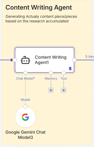 Each of the five article ideas is passed individually to an AI Research Agent powered by Google Gemini. This agent’s job is to enrich the article idea with substance before any writing begins. For each article, it surfaces: